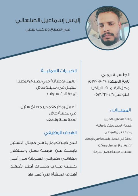 فني تصنيع وتركيب ستيل يرغب في العمل في أي مدينة من مدن المملكة العربية السعودية، إقامة قابلة للنقل خبرة تزيد عن أربع سنوات في المجال