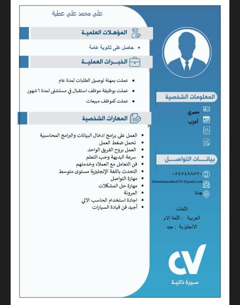 سوبر فايزر/ كابتن صالة / كاشير، خبرة أكثر من 7 سنوات في مجال المطاعم والفنادق، خبرة سنة في السعودية، التعامل والاستقبال الجيد مع العملاء التحدث بأسلوب راقي مع العملاء، العمل علي رفع المبيعات والتسويق للمكان، أجيد أل word وأل excel، العمل علي أنظمة كاشير مثل فودكس واوميجا، اسمي محمود مجدي علي، 27 سنة، موجود في الخرج حاليا لكن بنتقل لأي مكان