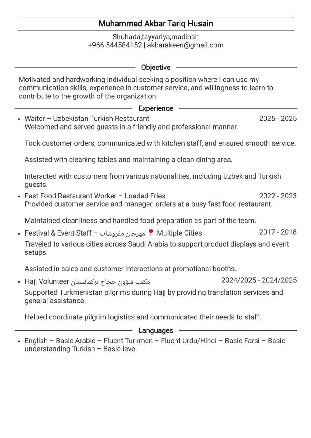I have experience working in restaurants as waiter (customer service and hospitality) furniture store sales, and burger preparation. I speak Arabic, English, Urdu, Persian, and Uzbek