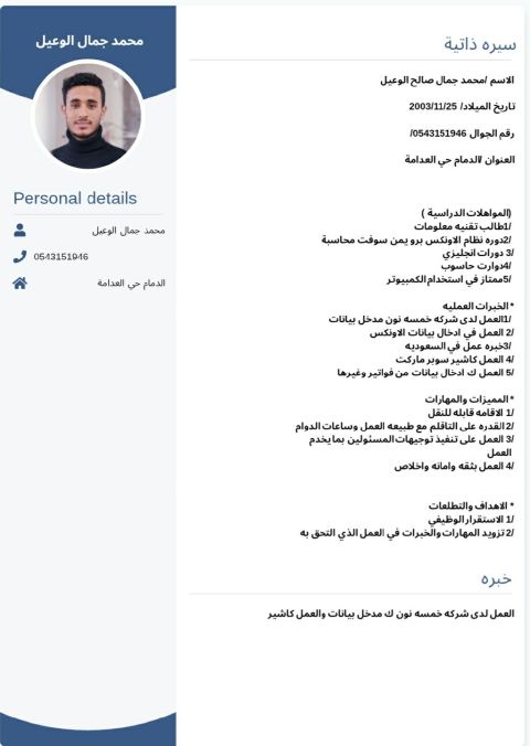 ابحث عن وظيفة موظف خدمات الكترونية أو مدخل بيانات كل البيانات الشخصية موضحة في السيرة الذاتية