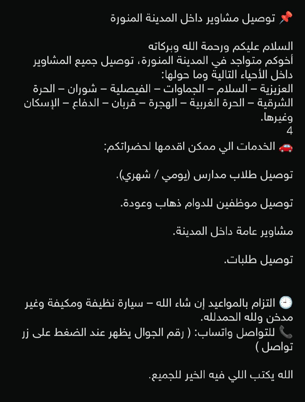 Transportation services available in Al Madinah Munawwarah covering Al Aziziyah - Al Salam - Al Jimaawat - Al Faisaliyah - Shouran - Al Harrah Al Sharqiyah - Al Harrah Al Gharbiyah - Al Hijrah - Qurban - Al Difaa - Al Iskan and nearby areas. Services include school transportation (daily/ monthly) employee transportation to and from work, general city rides and delivery of requests. Clean vehicle, non