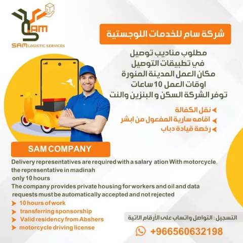 أحتاج مناديب في المدينة المنورة حي القربان توصيل لشركة كبيرة راتب 5000 شهري، شرط أتواجد سيارة لازم نقل كفالة إقامة تكون سارية وجود خبراء توصيل طعام