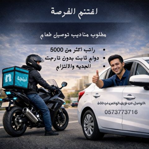 تعلن شركتنا عن فتح باب التسجيل للسائقين الراغبين في العمل كمناديب توصيل طعام بمدينة ينبع. هذه الفرصة موجهة لكل من يملك سيارة خاصة أو بسيارة الشركة ورخصة قيادة سارية، ويبحث عن دخل شهري يصل الى 6000 ريال وحوافز اضافية مجزية. نستقبلكم لاتمام اجراءات التسجيل في مقرنا الواقع ب ينبع البحر دور عزوز بجوار حمص وطعمية يوميا من الساعة 12 ظهرا حتى 10 مساء، طوال أيام الأسبوع عدا الجمعة. سارع بالتقديم فالعدد محدود