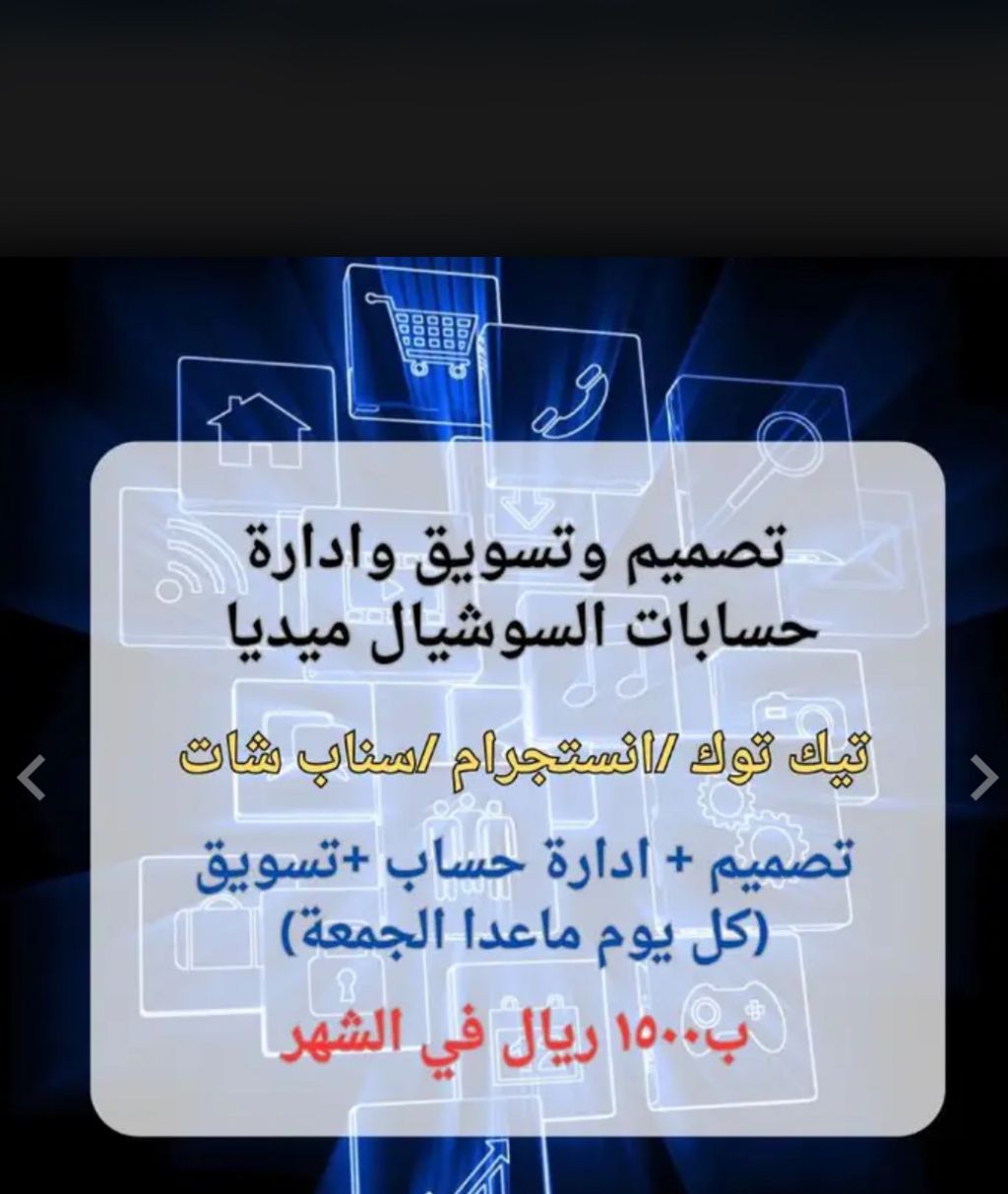 تصميم وتسويق وادارة حسابات سوشيال ميديا (تيك توك / سناب شات / انستجرام) ادارة الحساب عبارة عن تصاميم يتم تصميمها يوميا مع نشرها في الحسابات بالهاشتاق والتسويق للحساب بشكل يومي لخمس جهات معنية والرد على الرسائل (كل يوم ما عدا الجمعة) ب 1500 ريال بالشهر