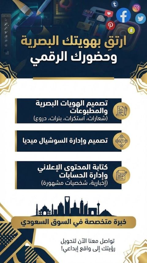 اصمم الهويات البصرية بشكل احترافي، وأقدم تصاميم السوشيال ميديا، اضافة الى تصميم المطبوعات بجميع أنواعها (أستكرات، بنرات، دروع، وغيرها) كما اعمل على إدارة حسابات التواصل الاجتماعي الأخبارية وحسابات شخصيات مشهورة داخل المملكة العربية السعودية مع تقديم خدمة كتابة المحتوى الاعلاني وصياغة المنشورات بأسلوب احترافي وجذاب
