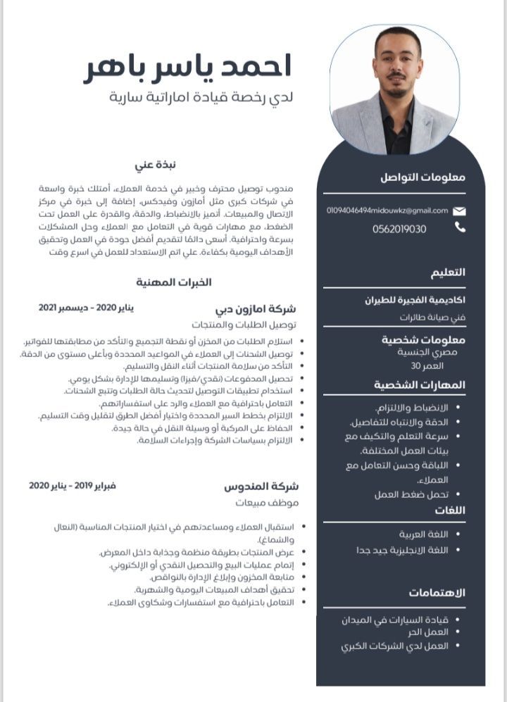 ابحث عن فرصة عمل - المدينة المنورة أنا أحمد ياسر، لدي خبرة قوية في مجال التوصيل وخدمة العملاء والمبيعات داخل شركات كبرى. الخبرات العمل كمندوب توصيل في شركات كبيرة (مثل أمازون وفيدكس) خبرة في توصيل الشحنات بدقة والالتزام بالمواعيد التعامل مع تطبيقات التوصيل وتتبع الطلبات تحصيل المدفوعات والتعامل المباشر مع العملاء خدمة العملاء خبرة في الكول سنتر واستقبال المكالمات حل مشكلات العملاء باحترافي
