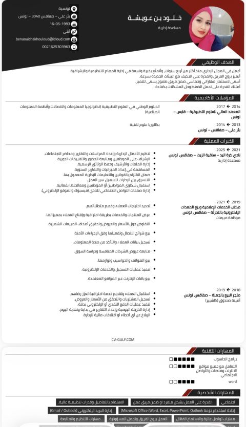 أنا مقيمة في تونس ولدي خبرة كبيرة كمتصرفة ادارية اعمل في المجال الاداري منذ أكثر من أربع سنوات، وأتمت ع بخبرة واسعة في إدارة المهام التنظيمية والإشرافية. أتميز بروح الفريق والقدرة على التكيف مع البيئات الجديدة بسرعة. أسعى لاستثمار مهاراتي وحما سي ضمن فريق طموح يسعى للتميز. امتلك القدرة على تحمل الضغط وحل المشكلات بكف
