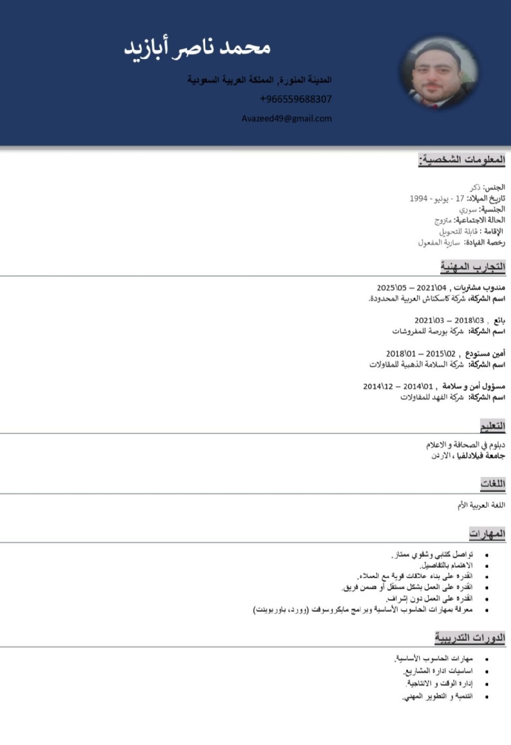 شاب سوري مواليد المدينة المنورة ابحث عن عمل مستعجل في أي مجال إقامة قابلة للنقل رخصة قيادة سارية