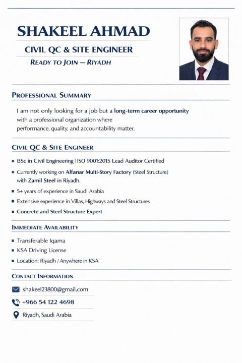 مهندس موقع وضبط جودة مدني بخبرة أكثر من 5 سنوات في السعودية، اعمل حاليا في مشروع مصنع الفنار متعدد الطوابق في الرياض. خبرة قوية في الخرسانة والهياكل الحديدية. إقامة قابلة للنقل ورخصة قيادة سعودية. جاهز للانضمام فورا