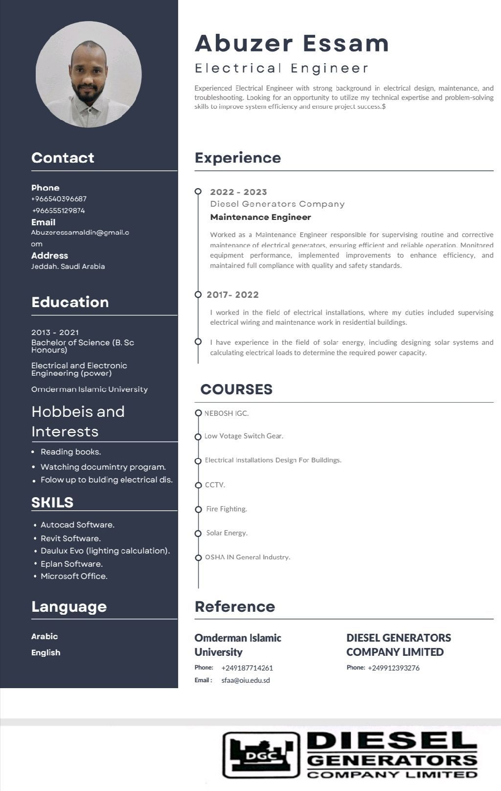 أنا مهندس كهربائي عملت في مجال المقاولات كمهندس اشراف وفي مجال المولدات كمهندس في قسم الصيانة