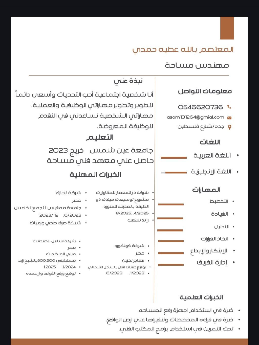 مساح موقع خبرة سابقة 3 سنوات وأجيد العمل على الاجهزة المساحية، وأجيد أعمال الصرف واللند أسكيب، والانشاءات