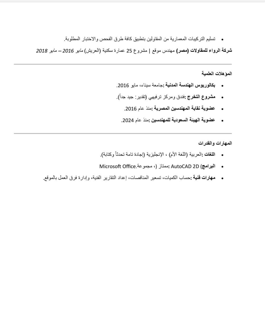 مهندس مدني تنفيذ خبرة 10 سنوات في أعمال الستيل والخرسانة وأعمال حصر الكميات