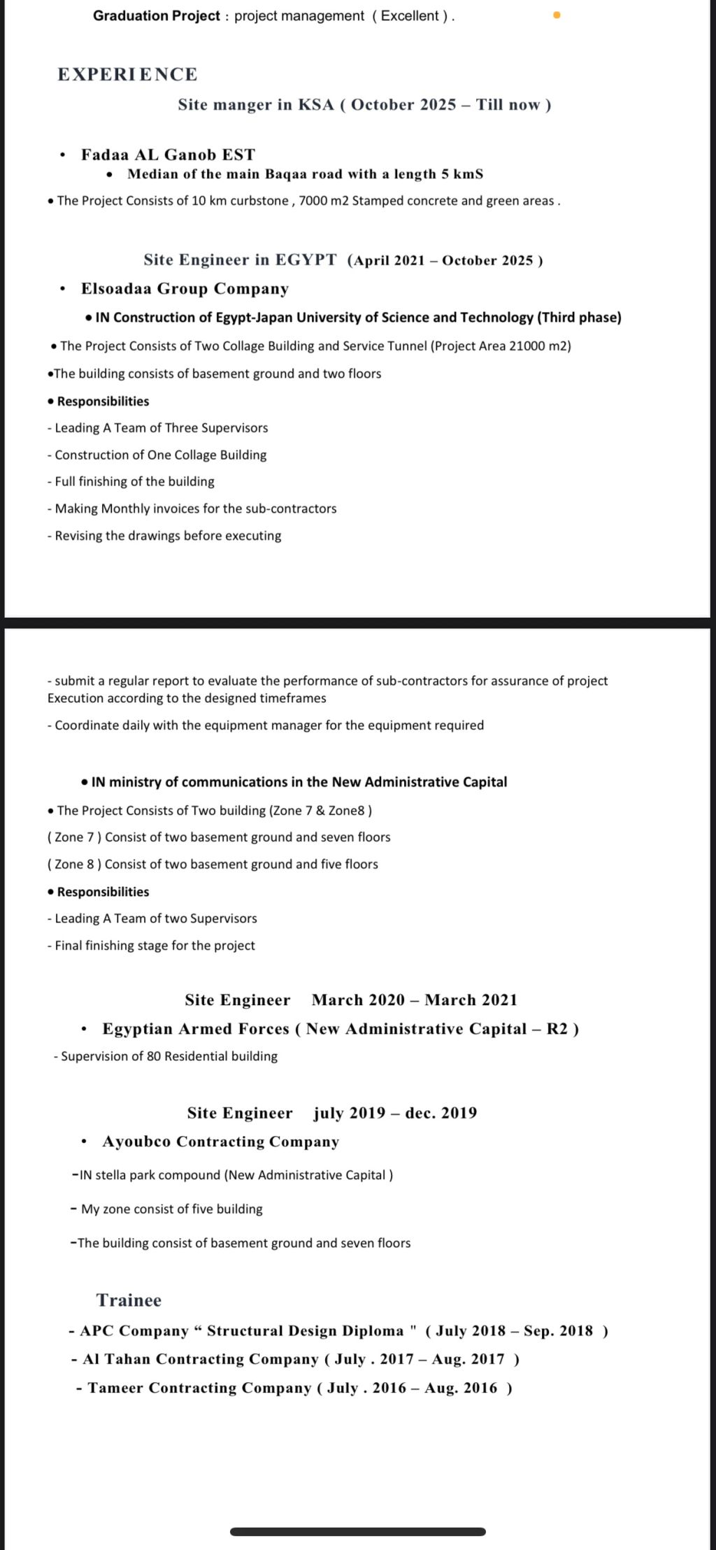 مهندس مدني خبرة 7 سنوات في مجال الانشاءات امتلك خبرة كبيرة في المشاريع الكبرى مثل الجامعات والوزارات عملت على انشاء الجامعة اليابانية بمدينة برج العرب كامل المراحل من خرسانات وتشطيبات ووزارة الاتصالات في العاصمة الادارية الجديدة مرحلة التشطيبات ومشروع صيانة الجزيرة الوسطيه بالشارع العام بمحافظة بقعاء منطقة حائل