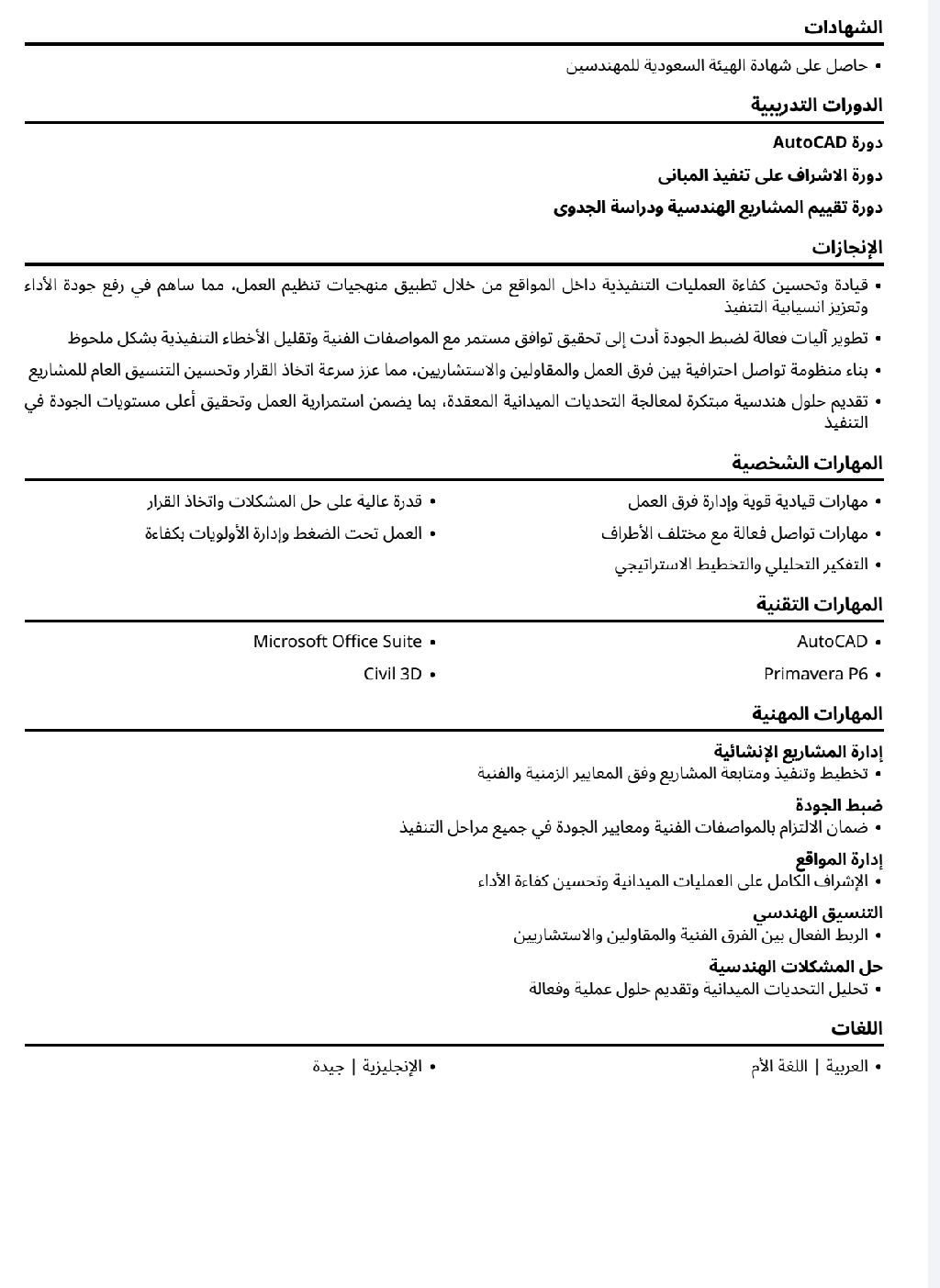 مهندس مدني بخبرة + 7 سنوات في الاشراف على المشاريع وإدارة المواقع، متخصص في ضمان جودة التنفيذ والالتزام بالمعايير والجداول الزمنية، مع مهارات قوية في حل المشكلات والتنسيق بين فرق العمل لتحقيق أفضل النتائج. إقامة سارية - عضوية سارية في هيئة المهندسين - يمتلك سيارة ورخصة قيادة