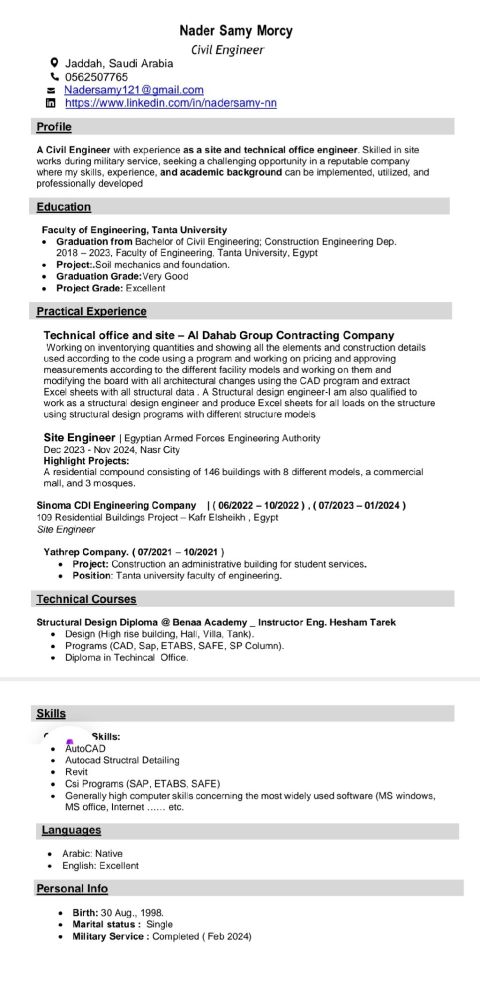 مهندس مدني حديث التخرج، المهنة في الإقامة مهندس مدني إقامة سارية قابلة للنقل، رخصة قيادة سارية عضوية سارية لدى الهيئة السعودية للمهندسين (SCE) ابحث عن فرصة عمل أو تدريب لاكتساب الخبرة وتعزيز مهاراتي في مجالات الهندسة المدنية. أتمتع باجادة اللغة الانجليزية والبرامج الهندسية وسرعة التعلم وأتميز بالاجتهاد والرغبة القوية والمستمرة في التعلم والتطوير، أسعى للمساهمة بفعالية في بيئة عمل احترافية