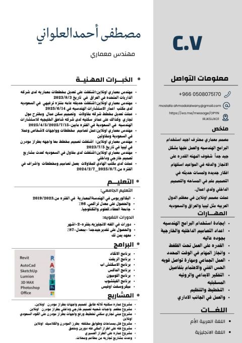 مهندس معماري حاصل على درجة البكالوريوس في المعماري ولدي المهارة في التصميم الداخلي والعمل المساحي للاستفسار والتواصل
