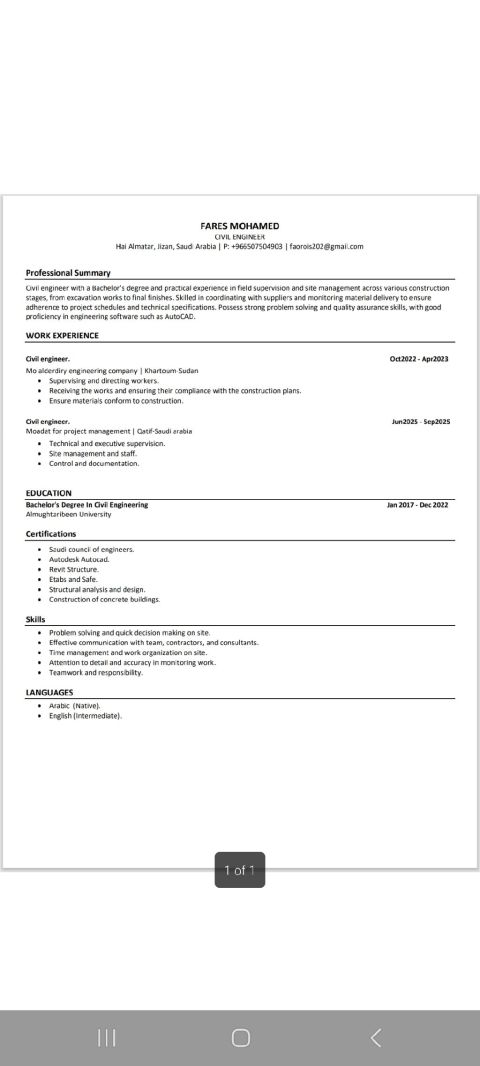 Civil engineer with + 5 years of experience, including 3 years in KSA (concrete works, finishing, and engineering offices supervising construction) registered with the Saudi Council of Engineers, holding a valid Saudi driver's license and a valid, transferable Iqama, Currently residing in Riyadh and willing to work anywhere in KSA in a suitable work environment