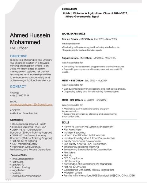 I am a chemical engineer with hands - on experience in chemical safety and Industrial environments. I am highly motivated to grow, contribute effectively, and add real value within a professional team in Saudi Arabia