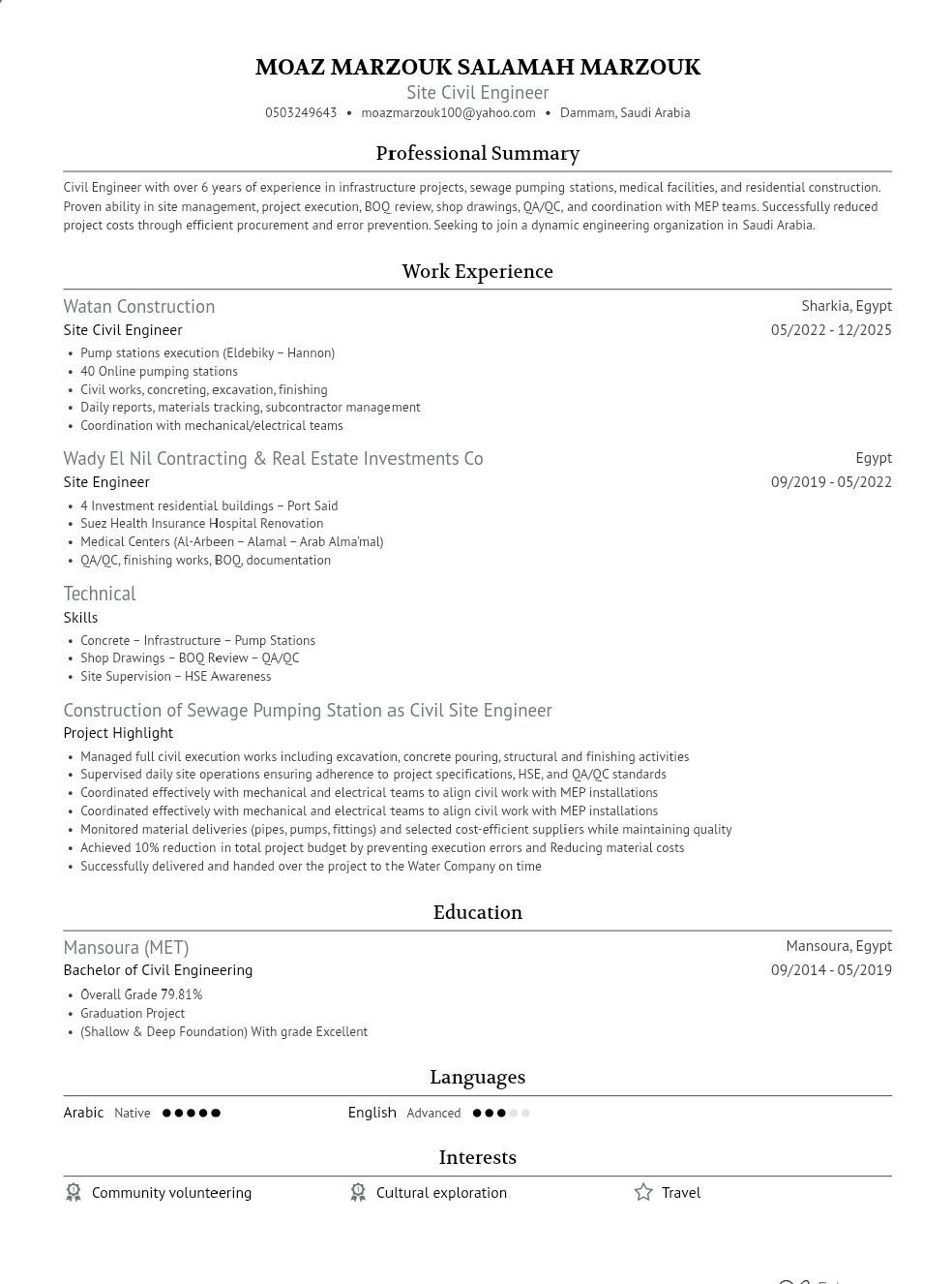 Civil Engineer with 6 + years of experience in executing hospitals, residential buildings (concrete & finishing) and sewage stations (pumping & treatment) Skilled in integrating civil works with MEP and supervising mechanical/ electrical installations. Transferable Iqama & valid driving skills. Seeking an opportunity in a professional environment to add value and grow