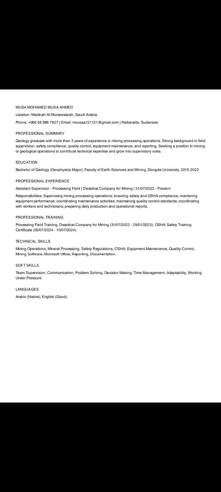 جيولوجي سوداني الجنسية ابحث عن فرصة عمل في الجيولوجيا أو المعالجة أو أي مجال ذي صلة، خبرة 3 سنوات في هندسة معالجة خام الذهب في مصنع CIL