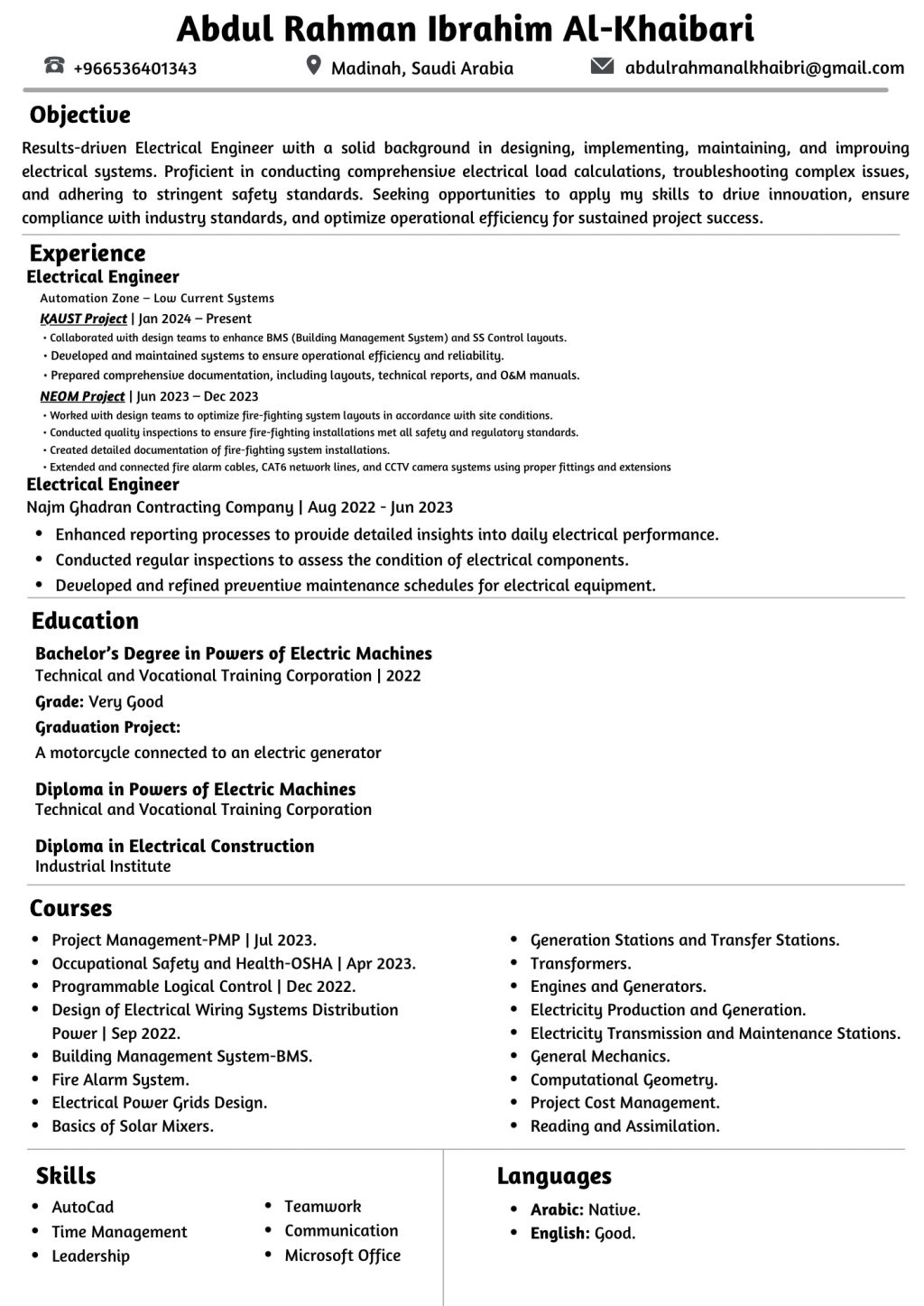 ابحث عن شاغر وظيفي مهندس كهرباء مهتم في أنظمة الكهربائية حيث امتلك خبرة عملية أربع سنوات في أعمال تنفيذيه والاشراف الميداني