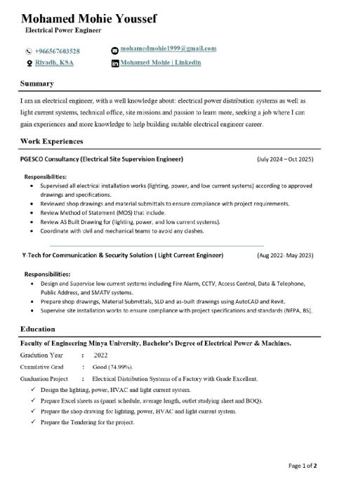 مهندس كهرباء خبرة أكثر من ثلاث سنوات في مجال الإنشاءات - الاشراف على تنفيذ الأعمال الكهربائية - تصميم وعمل لوحات تنفيذية لأنظمة التيار الخفيف - مراجعة اللوحات التنفيذية وكذلك اعتماد الخامات للأعمال الكهربائية - مراجعة المخططات النهائية (as built) التنسيق مع مهندسي المشروع لضمان التنفيذ السلس للمشروع وعدم حدوث أي تعارض