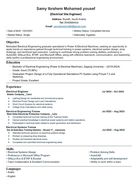 مهندس كهرباء دفعة 2024، ابحث عن فرصة للعمل داخل المملكة العربية السعودية كمهندس موقع للاشراف على تنفيذ الأعمال الكهربائية والتمديدات أعرف اشتغل Design lighting Design power Panel schedule, SLD S C calculation, V D Calculation Shop Drawing (ورقيات المشروع ملم بها) لو حد عنده فرصة كمهندس موقع تنفيذ ياريت لو في فرصة