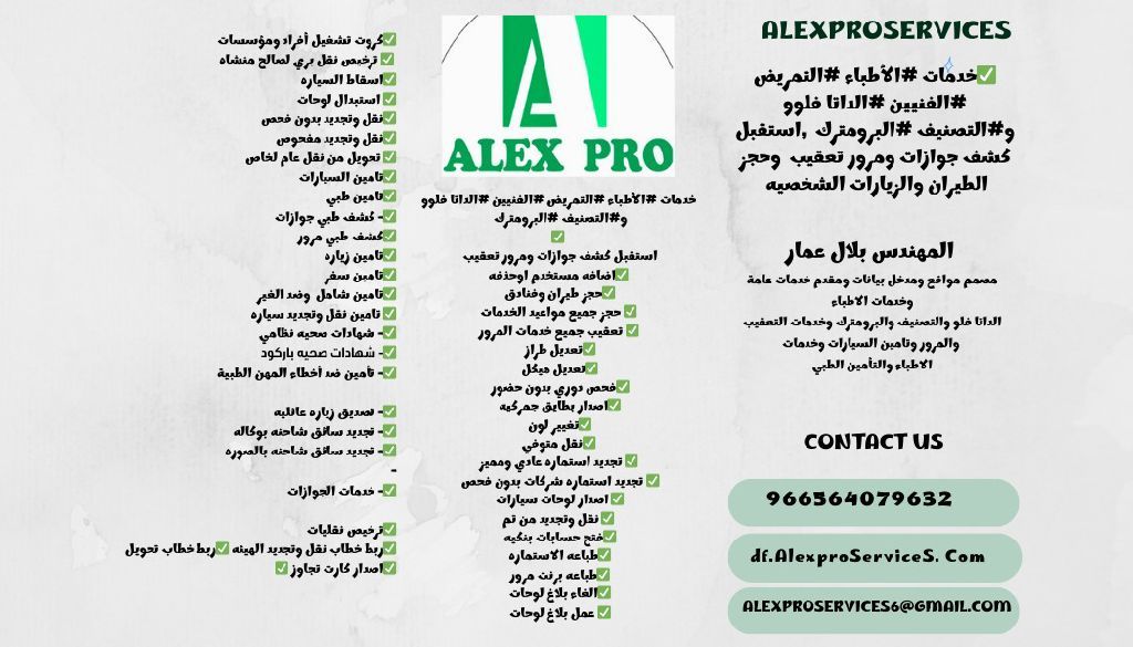 كل خدماتك الالكترونية والطبية والتأمين الطبي والسيارات ونقل السيارات والتعقيب والداتا فلووا والتصنيف والبرومترك ونقل وتجديد بدون فحص وفتح حسابات بنكية وحجز الزيارات الشخصيه كل خدماتك متاحه لدينا بكافة أنواع الطرق المختلفه تواصل. واتساب معنا