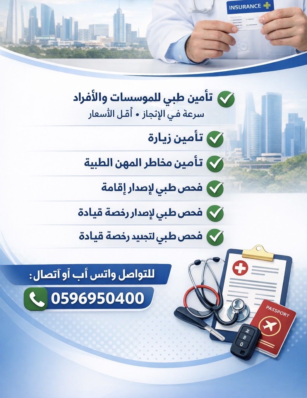 تأمين طبي للمؤسسات والأفراد سرعة في الانجاز وأقل الأسعار تأمين زيارة تأمين مخاطر مهن طبية فحص طبي لاصدار إقامة فحص طبي اصدار رخصة قيادة فحص طبي لتجديد رخصة قيادة التواصل واتساب أو اتصال