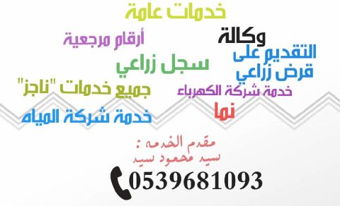 خدمات عامة. وكالة سجل زراعي. كروكيات. أرقام مرجعية خدمة شركة الكهرباء خدمة شركة المياه. جميع خدمات "ناجز" مقدم الخدمة سيد محمود سيد