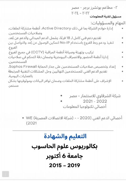 بكالوريوس تقنية معلومات بخبرة في تطوير المواقع الشبكات، الطابعات، وأنظمة المراقبة. متمكن في تحليل البيانات، وانشاء قواعد البيانات والتعامل مع أنظمة سطح المكتب. تركيب كاميرات المراقبة وربط اجهزة المكاتب في شبكة واحدة وادارتها بكفاءة. امتلك خبرة أكاديمية لمدة سنتين في تدريس تنقيب البيانات باستخدام Weka والذكاء الاصطناعي بلغة Prolog، اضافة الى خبرة حكومية في اعداد التقارير وصياغة المذكرات وتحليل