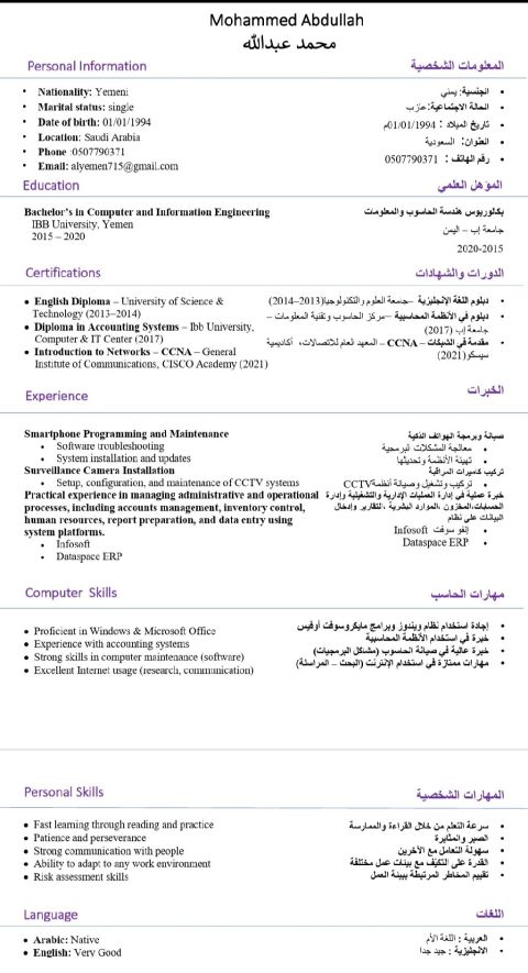 مهندس تقنية معلومات الجنسية 1. خبرة في مجال كاميرات المراقبه والشبكات. 2. خبرة في ادخال البيانات واستخدام الأنظمة المحاسبية Infosoft And Dataspace ERP 3. خبرة في برمجة الجوالات وصيانتها