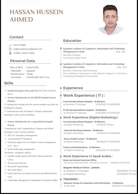 ابحث عن عمل في شركة أو مؤسسة في قسم الحاسب الآلي وتقنية المعلومات حيث انني خبرة 7 سنوات في صيانة الحاسب الآلي وأعمال الشبكات والدعم الفني والتدريب لبرامج التشغيل الحسابات والمستشفيات وأيضا كاميرات المراقبه وسنترال جراند ستريم وخبرة بالسوشيال ميديا والاعلانات وادارة الحسابات الالكترونية في المجال الطبي ومجالات أخرى متواجد في جدة إقامة قابلة للنقل