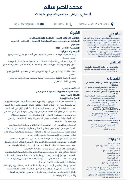 الاسم محمد جمعه الهدف الوظيفي بائع في محل سباكة وكهرباء، امتلك خبرة في التعامل مع الزبائن وفهم احتياجاتهم وتوفير المنتجات المناسبة لهم، وأساهم في زيادة المبيعات. الخبرات العملية مدة الخبرة عدة سنوات في مصر والسعودية المهام والمسؤوليات. معرفة أنواع الأدوات الصحية وقطع السباكة من مواسير خلاطات محابس تأسيس وتشطيب) معرفة أساسيات المواد الكهربائية (أسلاك، مفاتيح، أفياش، لمبات، وجميع الديكورات)