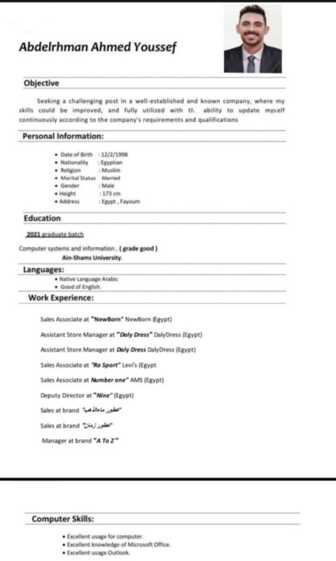 مؤهل عالي نظم ومعلومات كمبيوتر خبرة 10 سنوات في مجال السيلز في الملابس، والعطور