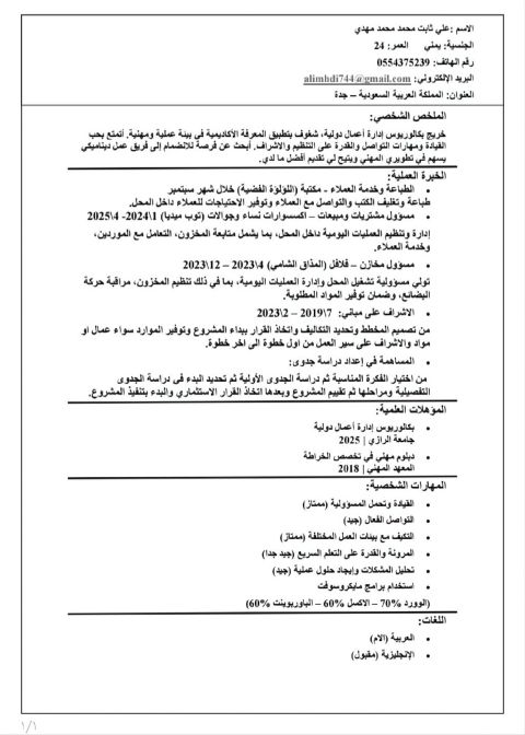 علي ثابت مهدي من اليمن عمري 24 بكالوريوس إدارة أعمال دولية جامعة الرازي ابحث عن فرصة عمل في المشتريات أو المبيعات أو سكرتير أو مساعد اداري أو خدمة عملاء أو الحسابات عندي القدرة والكفاءة وحب العمل والالتزام وتحمل المسؤولية وضغط العمل ومستعد للعمل تحت التجربة