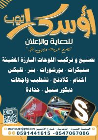وكالة أوسكار توب للدعاية والاعلان يوجد لدينا تصنيع وتركيب اللوحات البارزة المضيئة - ستيكرات - بور شاورات - بنرات - فليكس - أختام - كلادينج - تشطيب واجهات - ديكور أستيل - حدادة