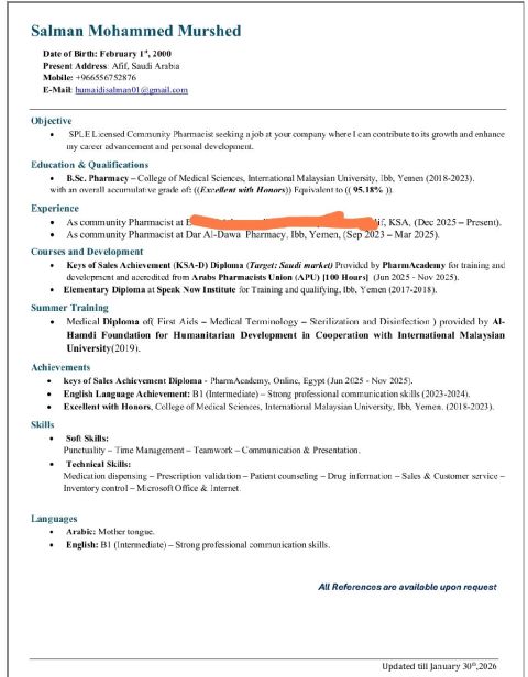صيدلاني حاصل على درجة البكالوريوس في الصيدلة، ومسجل في الهيئة السعودية للتخصصات الصحية امتلك خبرة أكثر من سنة في السعودية خبرة واسعة في صرف الادوية والتحقق من الوصفات الطبية، حاصل على التصنيف المهني السعودي (ساري المفعول) كما امتلك مهارات متميزة في تقديم المشورة للمرضى وتوصيل المعلومات الطبية بشكل واضح أسعى للانضمام الى فريق عمل متطور حيث يمكنني تطبيق خبراتي ومهاراتي والاسهام في تحقيق أهداف المؤسسة
