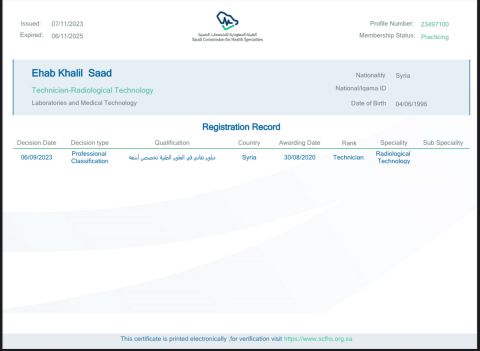 فني أشعة سوري زائر يبحث عن عمل لدي تصنيف وسبق أن عملت في خميس مشيط عن طريق عقد أجير