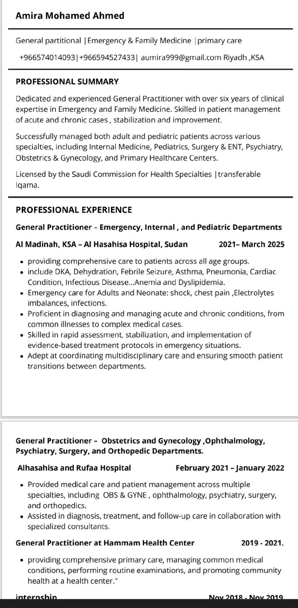 طبيبة عامة حاصلة على بكالوريوس الطب والجراحة، وطب الحجامة من المركز الوطني للطب البديل ولدي خبرة في طب الأسرة، طب الطوارئ'الباطنية والاطفال، ورعاية الحالات الطبية الشائعة. ابحث عن فرصة عمل كطبيبة عامة وأسعى لتقديم أفضل الخدمات الطبية بما يحقق جودة الرعاية للمرضى ويساهم في تطوير وتعزيز سمعة المؤسسة الصحية