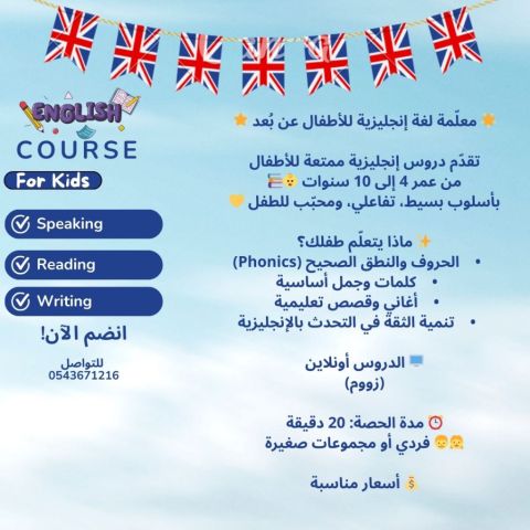 معلمة لغة انجليزية للاطفال عن بعد تقدم دروس انجليزية ممتعة للاطفال من عمر 4 الى 10 سنوات بأسلوب بسيط، تفاعلي، ومحبب للطفل ماذا يتعلم طفلك - الحروف والنطق الصحيح (Phonics) كلمات وجمل أساسية - أغاني وقصص تعليمية - تنمية الثقة في التحدث بالانجليزية الدروس اونلاين (زووم) مدة الحصة 20 دقيقة فردي أو مجموعات صغيرة أسعار مناسبة للتواصل والتسجيل