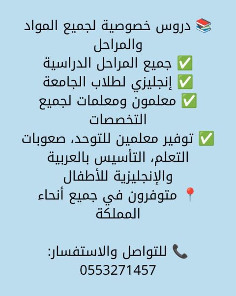 أنا معلمه أدرس جميع المواد والمراحل الدراسية وانجليزي للجامعة وأوفر معلمين ومعلمات في جميع أنحاء المملكة العربية السعودية وخبرة أكثر من 10 سنوات وأسعار مناسبة للفرد للتواصل