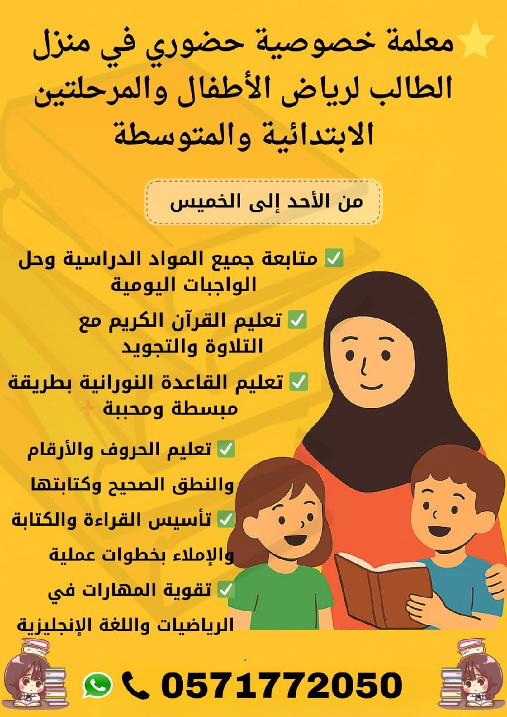 معلمة خصوصية حضوري في منزل الطالب لرياض الاطفال والمرحلتين الابتدائية والمتوسطة الأيام من الأحد الى الخميس التدريس حضوري في منزل الطالب (راحة وأمان لطفلك)