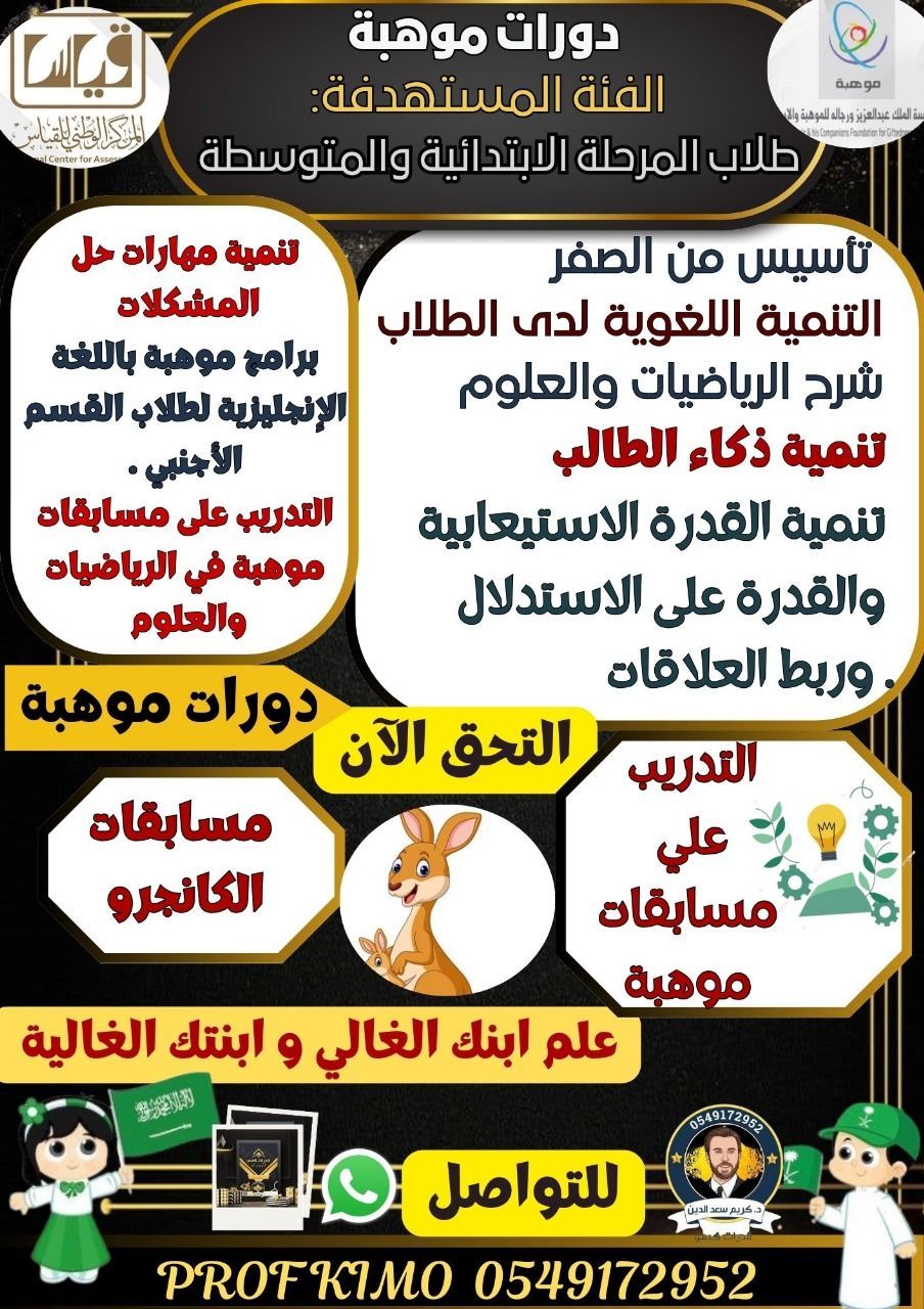 أقوى دورات تأسيس موهبة للطلاب، المراحل الابتدائية والمتوسطة، طريقك الى أل 100، والحصول على منح مشاريع الملك عبدالله رحمة الله والملك سلمان حفظه الله للموهوبين، أسس ولدك ومن هنا ومعنا يكون التميز والتفوق