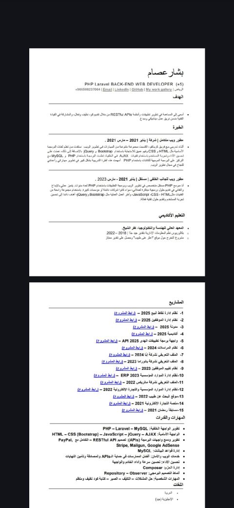 أنا بشمهندس بشار عصام مبرمج مواقع وأنظمة ويب Back - end PHP Laravel خبرة 5 سنوات متواجد في الرياض ابحث عن فرصة عمل إقامة قابلة للنقل