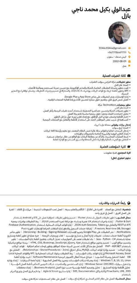 مبرمج تطبيقات موبايل ومواقع ويب بخبرة في تطوير تطبيقات Android وiOS باستخدام Flutter، مع قدرة عالية على بناء تطبيقات متكاملة ذات أداء عال وتجربة مستخدم احترافية. امتلك خبرة في تصميم واجهات حديثة، ربط التطبيقات مع واجهات برمجة التطبيقات (REST APIs) والتعامل مع قواعد البيانات مثل Firebase وSQL، اضافة الى تطوير مواقع ويب باستخدام تقنيات الويب الحديثة. أجيد كتابة كود منظم وقابل للتوسع