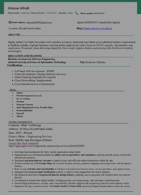 مطور تطبيقات جوال ماهر، متخصص في Flutter، ولديه خبرة 3 سنوات. خبرة في بناء تطبيقات جوال قابلة للتوسع وعالية الأداء، مع تركيز قوي على تصميم واجهة وتجربة المستخدم وتقديم تجربة استخدام سلسة. متمكن في REST APIs وFirebase والدردشة الآنية والاشعارات الفورية وتكامل خرائط Google. باحث عن وظيفة بدوام كامل