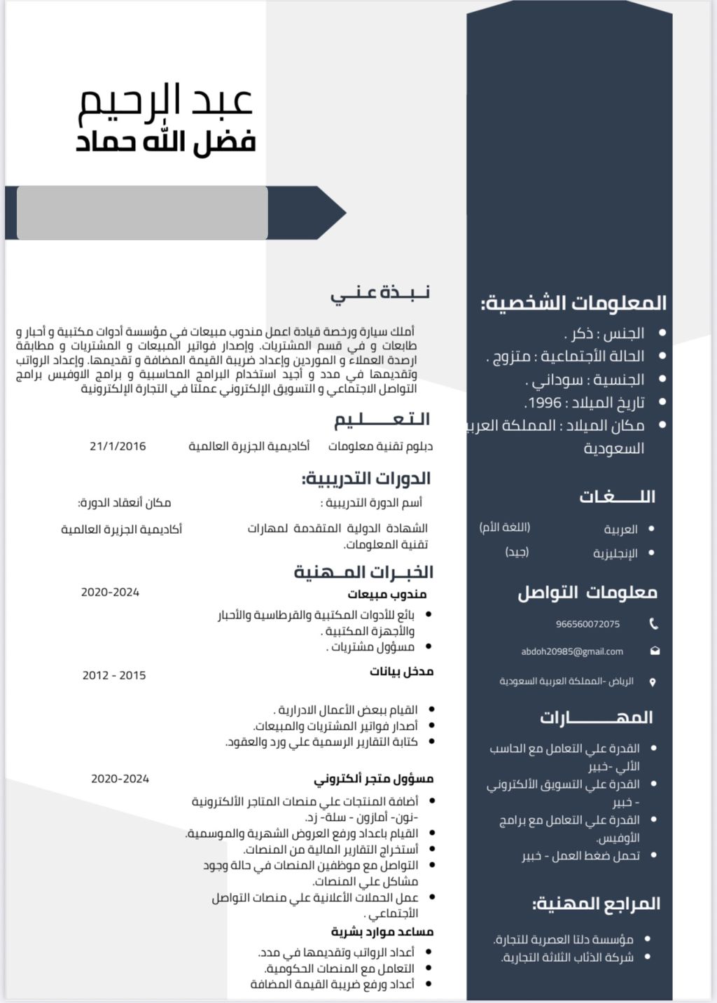 ابحث عن عمل مواليد المملكة العربية السعودية سوداني الجنسية 28 عام أملك سيارة ورخصة قيادة اعمل مندوب مبيعات في مؤسسة أدوات مكتبية وأحبار وطابعات وفي قسم المشتريات. واصدار فواتير المبيعات والمشتريات ومطابقة أرصدة العملاء والموردين واعداد ضريبة القيمة المضافة وتقديمها. وأجيد استخدام أغلب البرامج المحاسبية السحابية وبرامج الأوفيس، التجارة الالكترونية اضافة المنتجات ومتابعتها متابعة الطلبات وارسالها