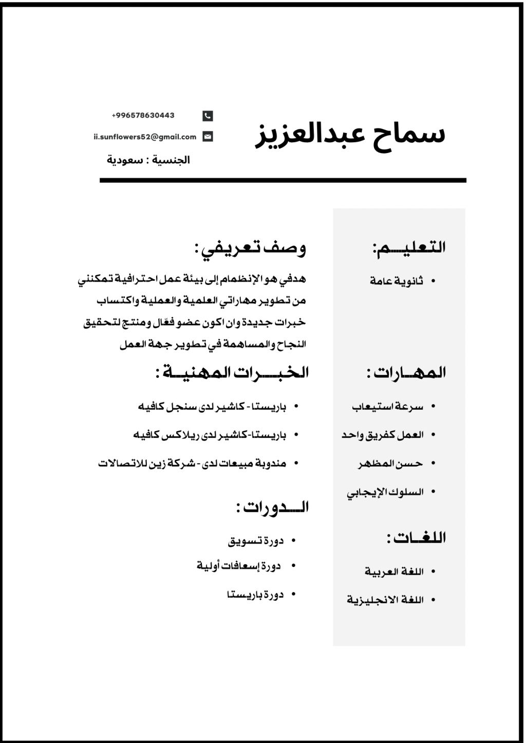 أنا بنت سعودية ابحث عن وظيفة باريستا أو كاشير أو مبيعات وتسويق