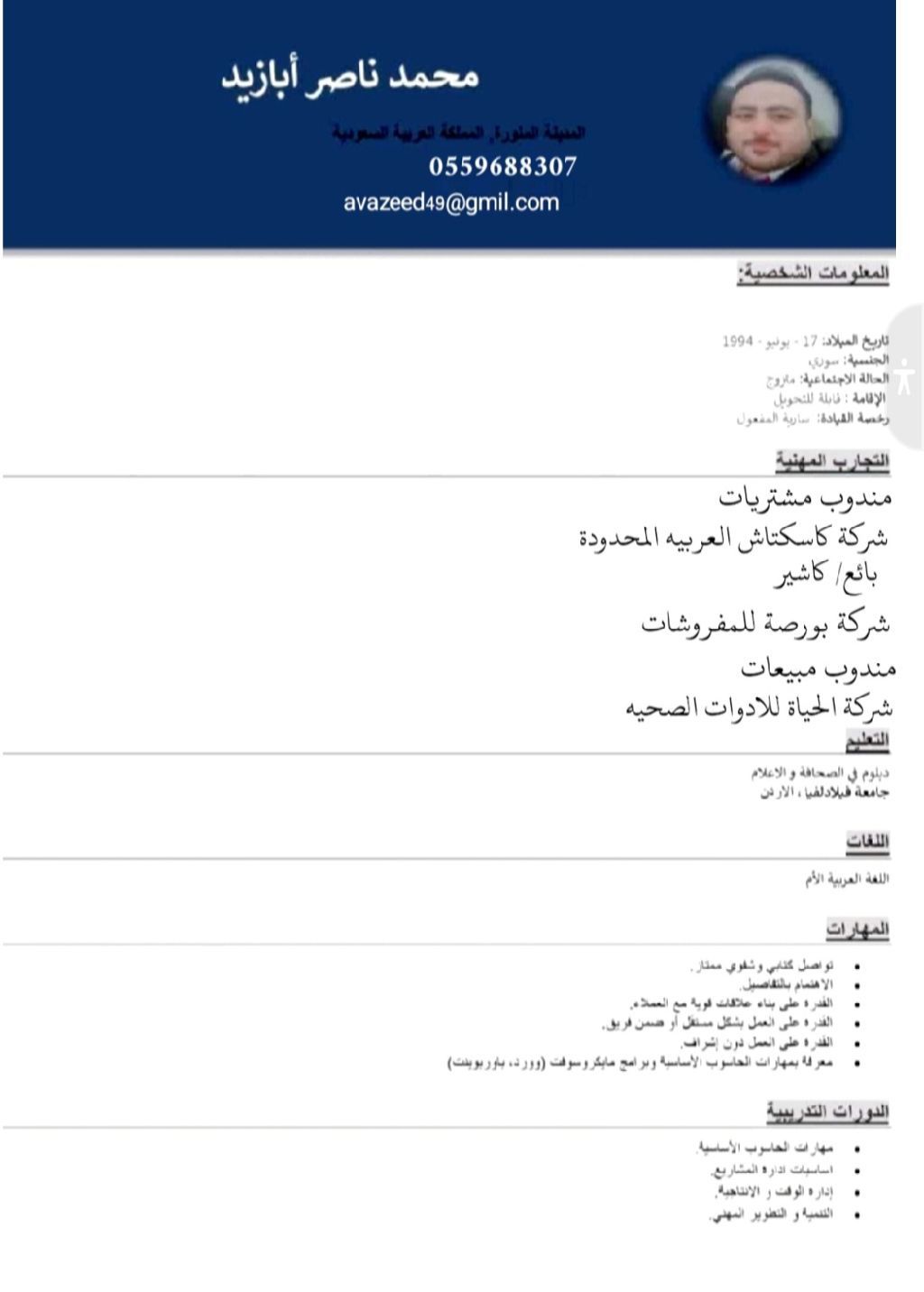 شاب سوري مواليد المدينة المنورة، ابحث عن عمل البدء فوري إقامة قابلة للنقل رخصة قيادة سارية